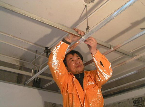 2、收邊條粘好后,再確定在天花上打孔的位置,首先要確定的是鋁梁安裝的位置,盡可能讓兩邊的距離相等。根據鋁梁的長短確定打孔的多少(一般4個孔)。然后再確定邊上主龍骨的安裝位置。待孔打好后,根據安裝的吊頂高度,再截取絲桿,一般是從天花板到吊頂的高度減去六公分。